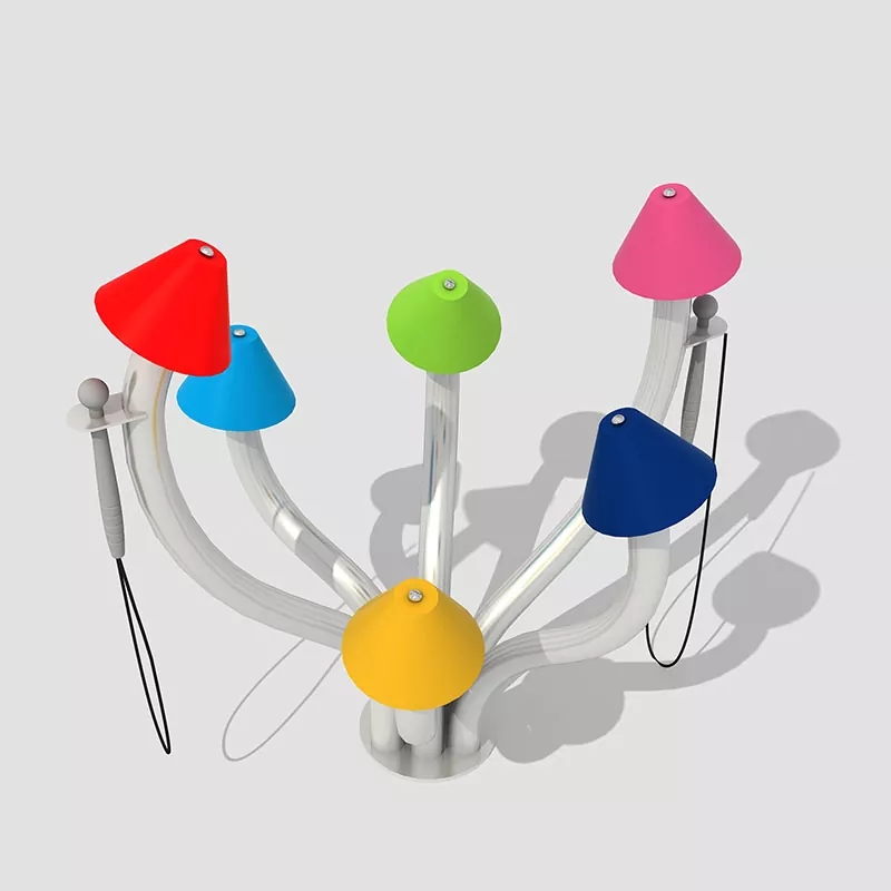 Վեց փոշու ծածկույթով կոնաձև «գլխարկների» հավաքածու՝ վառ գույներով, որոնք պարունակում են ծալքավոր չժանգոտվող պողպատից ձողեր տարբեր բարձրությունների և անկյունների վրա՝ դարձնելով այն տպավորիչ տարր, որը շուտով կդառնա ամենատարածվածը: