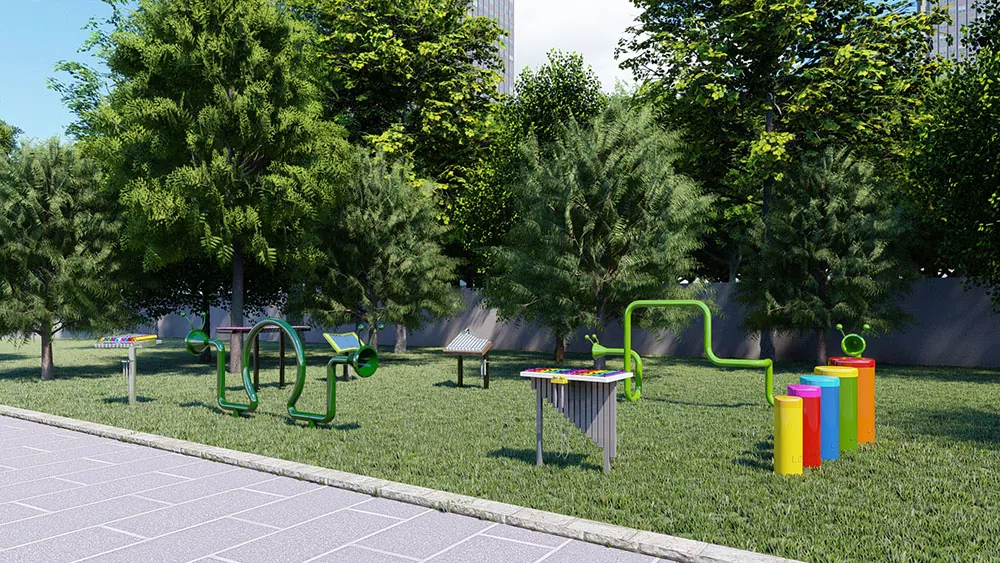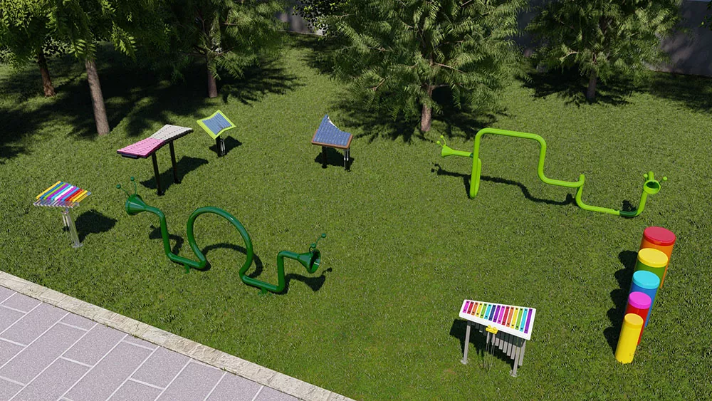 Մելոդի բացօթյա երաժշտական ​​պարկի գործիքի պարզ սուրճի գույնը հրահրում է խորը աշնանի հիշողություններ եւ ուժեղացնում է ցանկացած տարվա բացօթյա միջավայր: Շատ հարմար է զբոսայգիների, խաղահրապարակների եւ այգիների համար, այն խրախուսում է բոլոր տարիքի մարդկանց եւ կարողությունների մարդկանց ուսումնասիրելու համար: Ներդաշնակ անսամբլին հասնելու համար մեղեդու եւ ռիթմի գործիքների անխափան համադրությունը ապահովում է տարածքի խնայող դուետ, որն ավելացնում է մեղեդային հմայքը ցանկացած միջավայրի: